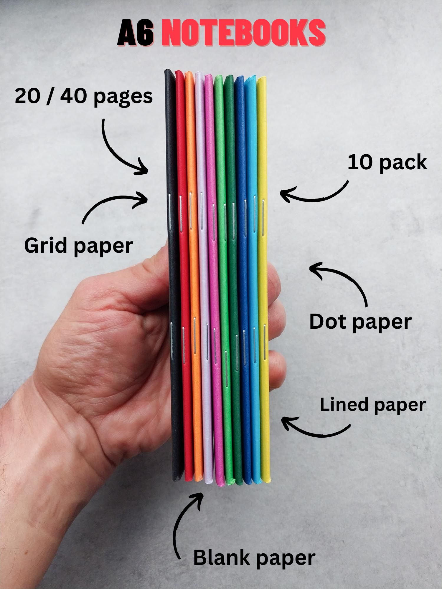 A 10 pack of A6 notebooks with 20 or 40 pages each. Perfect for stocking stuffers. keeping in your purse, to do lists and general notes.
