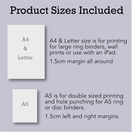 3 common sizes are included with your purchase. A5, A4 and US Letter.