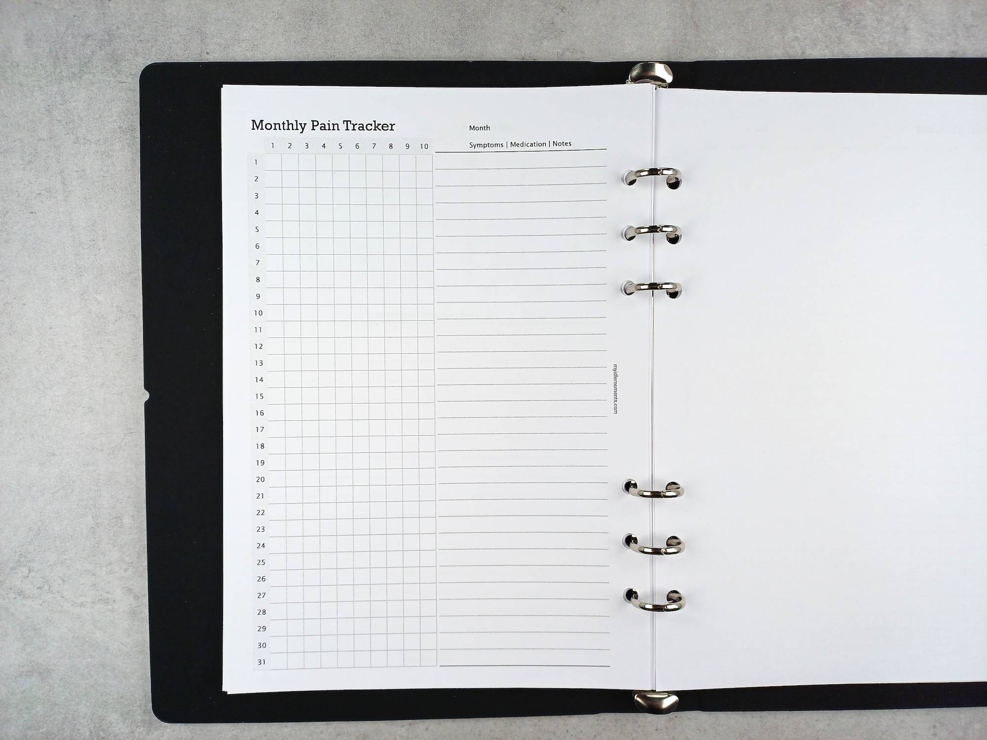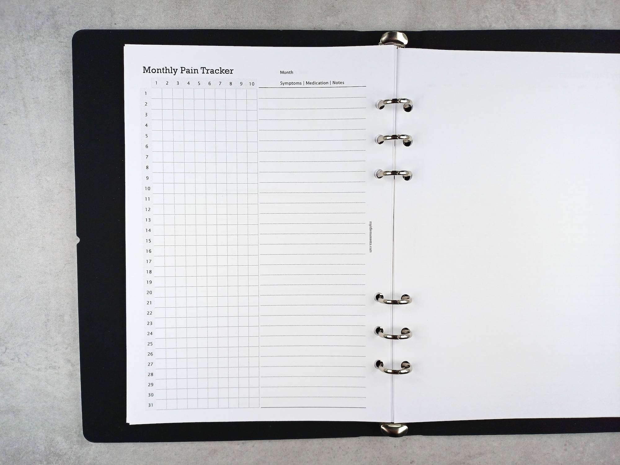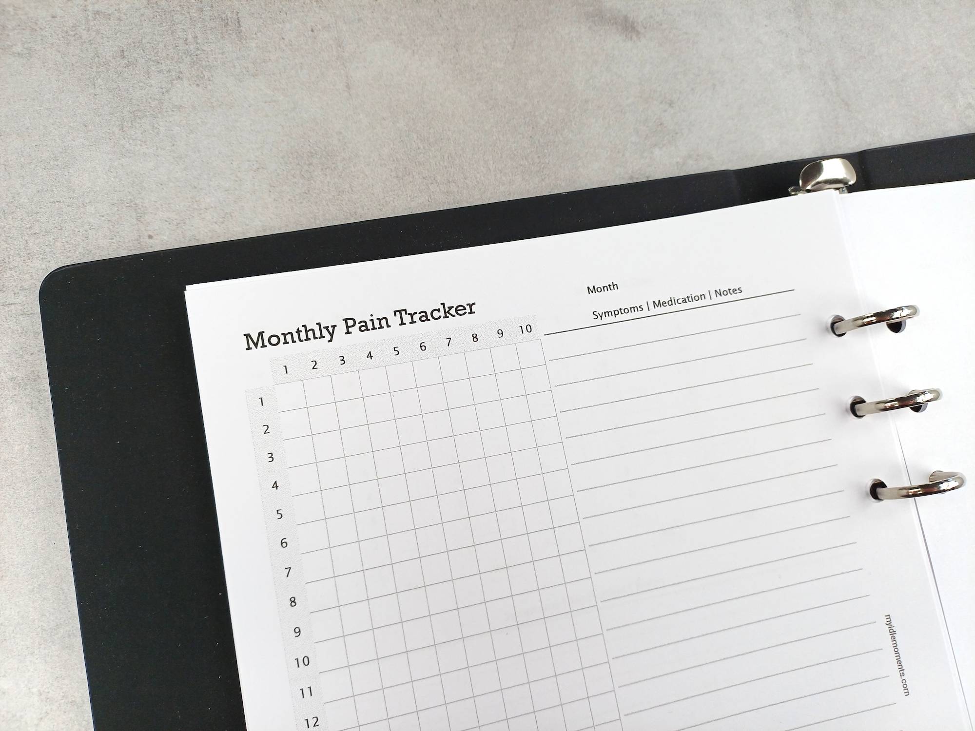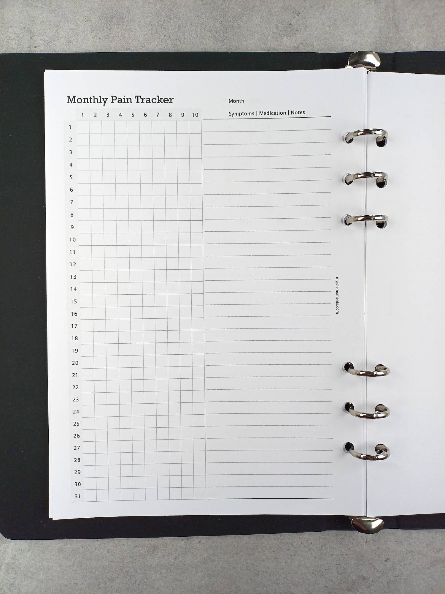 Monthly pain tracker sizes